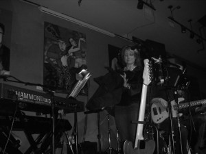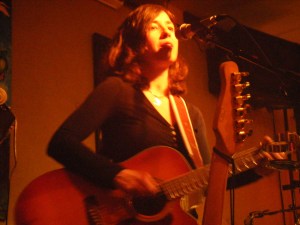 Marybeth and I  chatted earlier in the musty basement that serves as the green room.  She’d want you to believe that she’s more of a pure journalist and writer or even ‘a dork’ (her words), than just a songwriter. Indeed, she works as a business journalist when she’s not focused on the craft of songwriting and performing.   Her music appears to touch upon the darkness within her life, along with parts of the dark sides in others. One outward subject she mentioned on stage was re  Kenny Richey, who was wrongfully convicted in 1986 for various felonies. The case was made an example of by Amnesty International.  Her songs are delivered with a minmum of anger, emotion and dash. preferring to let her stories deliver the messages.  She remarked feeling compelled to mention when she was to sing a ‘happy’ song.  She likened one song “Don’t Look Back” with an insistent three-chord groove all throughout, to “Don’t Fear The Reaper”, a classic rock staple by Blue Oyster Cult. Marybeth’s song style closely resembles that of another local indie songwriter, Sharon Goldman, differing in tone and mood for the most part.
