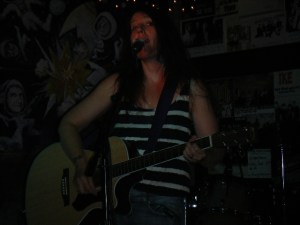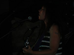Jill performed a solid 40 minutes, solo acoustic. Her personna is straightforward, with slightly aggressive lyrics and the occasional faraway look in her eyes. Don’t let the sweet delivery of her voice fool you. Her songs have a bit of backbite in them as well. You can imagine the rock star inside her, as she sports a tattoo on her right forearm with her husband’s name on it, and a sun firmly tatted on the inside of her left wrist. One wonders how she might have sounded as a youth. “Riverbed” which appears on her prior CD “It’s All In How You See Things” was the standout song, with a good guitar and vocal groove. Jill sold two sets of t-shirts with lyrics including “If you leave me I’ll kill you” and “sometimes I tell the truth”. She also performed a song in the style of Jack White, musing on how he might have written one of her songs. In Jill’s entourage was Andrea Nardello, herself a local songwriter, based in South Jersey.