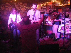 Lower Merion,PA songwriter Max Seidman finished out with a series of country-rock/Americana originals and some choice covers such as “The Weight”, and another which got one guy off his seat and egging on the band. Max mentiond earlier in the evening to me that the band was doing their second ever show together. The sound is thoughtful and engaging. Richie Allen, he of local folk act The Midvale 9, was present on lead guitar. Their bassist, whose name escapes me, was sporting an Uzimon t-shirt. Being a fan of the comedy-reggae star, I inquired about the shirt. He actually is in Uzimon’s band, and they’re recording their 3rd album! Max, with ten years experience recording and performing in Philly, last released an album in 2009. I’m aiming to see more of his craft with this new ensemble, which brough some good rock to the crowd returning from upstairs. As I left I remembered to pick up a free CD at the bar, songs by acoustic songwriter Tyler Spooner, who had performed during the weekly open mic recently. Also near the door was a CD by hip-hop artists The Booster Club, whose members include Danny Newport and Kapano.