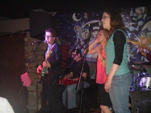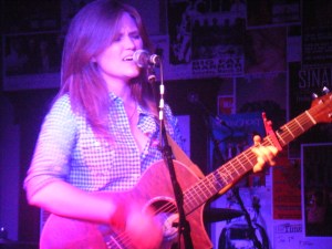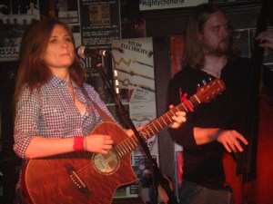 “Hi, my name is Paige, and I sing songs that I make up”….So began the set by Paige Allbritton, veteran singer/songwriter who loves life, loves to perform, and who had last released music in 2007. She performed in blue jeans, toned blue-square patterned shirt, with a red-heart sticker to show off her love for her mom (it would be Mother’s Day the next day) and a cherry-wood Ibanez acoustic. She owns a clear, strong voice (a bit of Joni Mitchell’s trill), and a stage presence that’s both serious and mirthful. Two of the songs in the set were especially well received, “Love Of A Lifetime” and “Secrets”. Both songs would fit well in TV and film. She closed with “The Killing People Song”, which represents a few of the themes in her songwriting, somewhat dark and reflective. One song I recall had references to Jack and gin tho I don’t recall  the title. Performing on standup bass was multi-instrumentalist Reverend T.J. McGlinchey.
