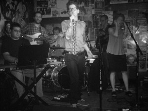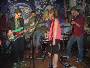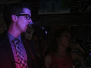 Chris Schutz and The Tourists celebrated the release of their new CD “Summer In The Sun”, firstly with a handsome food spread on the 2nd floor, then following with a solid pop-rock effort on the main level. This is a 7-piece band with keyboards, drums, 3 guitars, and 2 backing vocalists. Their music style varies between the various members. A proud independent-music veteran, Chris told me before the show that all the members are classically-trained, conservatory graduates. And, indeed, Chris does have a firm hold on the band’s sound, orchestrating their sound and orientation on stage carefully. Their approach recalls Elvis Costello and Graham Parker, with guitars and keyboards ringing strongly in each song. For most of the show they kept to one principal vocalist (I believe her name is Steph Hayes), and their 2nd joined in on a few. Chris’s stage experience was evident, scoring well with his original material plus a cover of The Beatles’ “Golden Slumbers”. Chris was dressed in dark blazer and slacks, plaid tie, pinstriped shirt, and (keeping it rock-n-roll), green lace-up shoes, matching his greenish-blue Lakland bass.